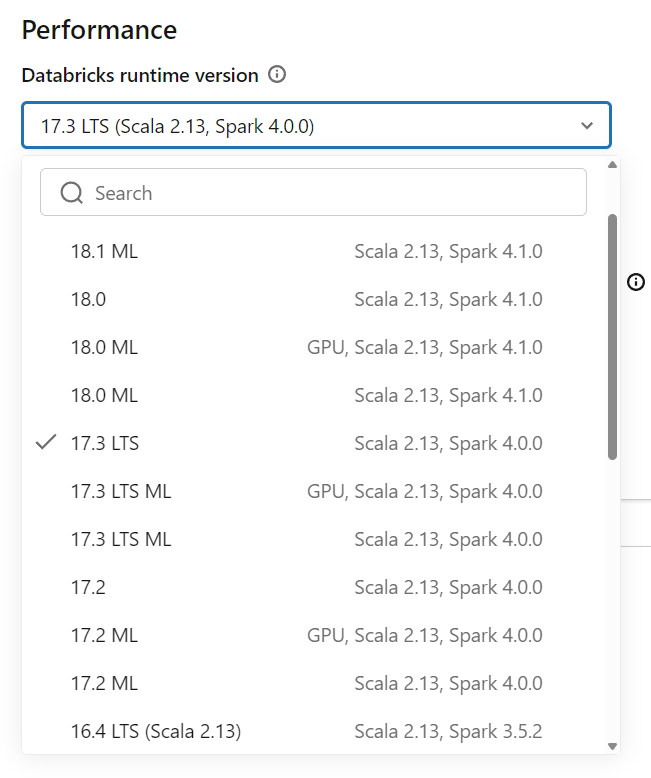 The standard runtime works for general-purpose data engineering and analytics. The Machine Learning runtime comes with popular ML libraries pre-installed, including TensorFlow, PyTorch, scikit-learn, and XGBoost — saving you the hassle of installing and managing these dependencies yourself. The Photon runtime is an optimized engine that accelerates SQL and DataFrame workloads and can deliver significant performance improvements on large-scale data transformations.