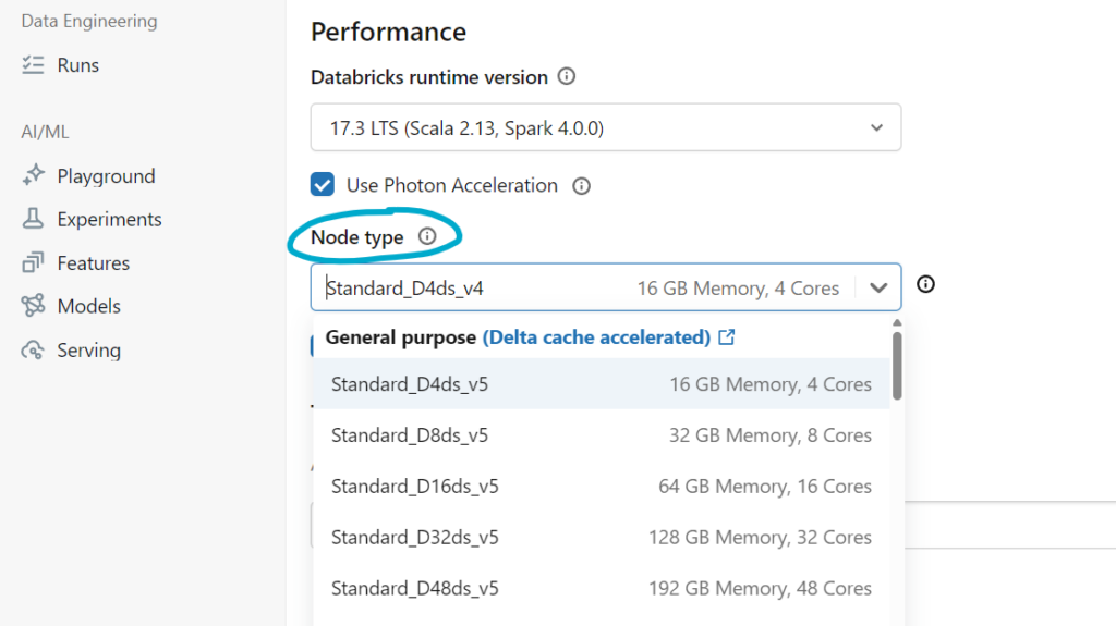 The node type determines what kind of Azure virtual machine each node uses. Databricks exposes a wide range of Azure VM sizes, each with different combinations of CPU, memory, and disk. Your choice depends on the nature of your workload.